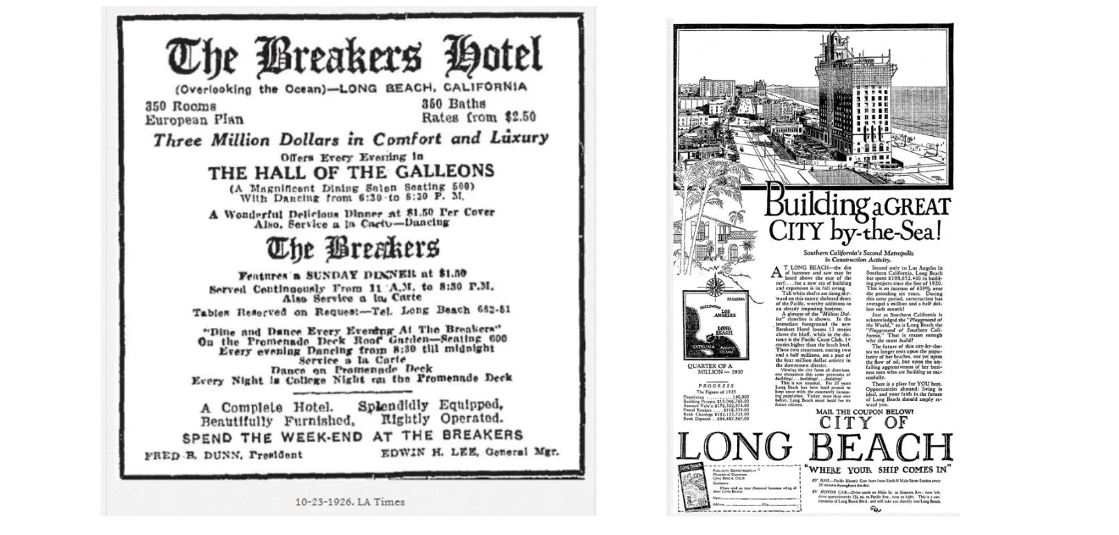 The doors open in grand fashion. Known simply as The Breakers, the building debuts with a gala of music, dancing, and Jazz Age glamour. Innovative amenities — including in-room radio and a rooftop garden for evening dancing — make it an instant social centerpiece for Long Beach.